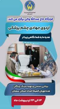 جانشین قرارگاه حاج عبدالله والی در استان سمنان از برگزاری اردوی جهادی چشم پزشکی به همت جانشین قرارگاه حاج عبدالله والی و مشارکت گروه جهادی چشم پزشکی به مدت 10 رو ز در استان سمنان از 13 اردیبهشت الی 23 خبر داد.